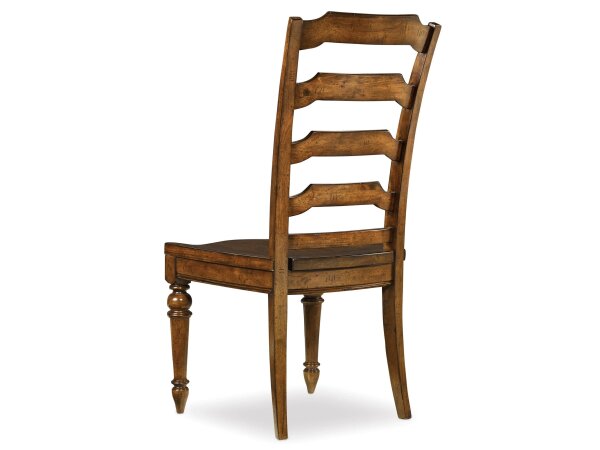 Ladderback side chair in a warm chestnut finish over figured alder veneers with shaped slats and legs. Scooped wood seat offers comfortable dining support.