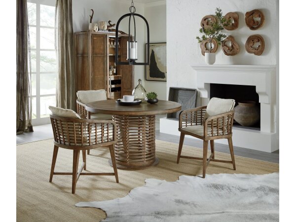 Dining arm chair with woven rope back, Cliffside dark wood frame, and an upholstered seat with loose pillow back in Zuri Cream performance fabric. Casual style suits relaxed dining spaces.