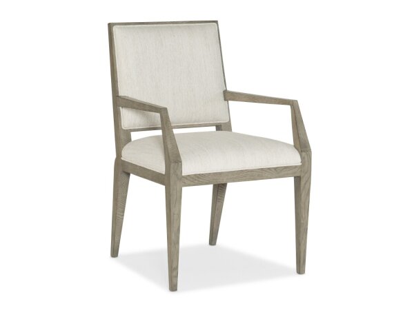This Paradise Valley upholstered ladder back arm chair is crafted from rubberwood solids with a Saddle Brown finish and distinct traditional styling. It features a padded seat upholstered in tobacco leather-like fabric, shaped scrolled arms, and nylon gli