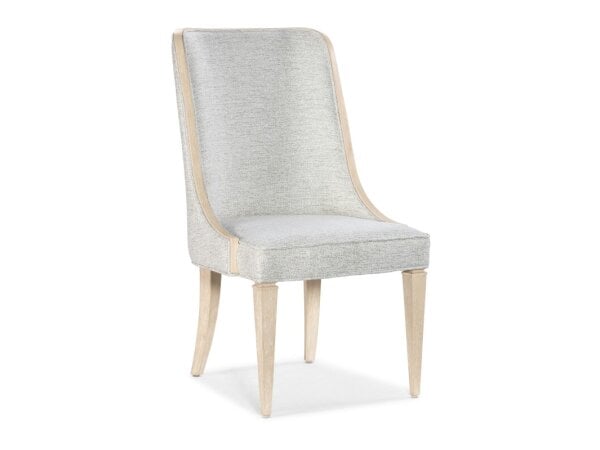 The Allyson Park slat back side chair, crafted from poplar and rubberwood solids, features a wire brushed white finish with a charcoal curved wooden seat. It includes a slat back, square tapered legs, and nylon glides for floor protection, offering a clas