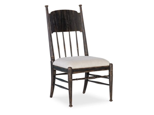 This Hearthstone Ridge Windsor back side chair is crafted from rubberwood solids with a black finish. It features a shaped seat for comfort, splayed tapered legs, and nylon glides to protect your floor.