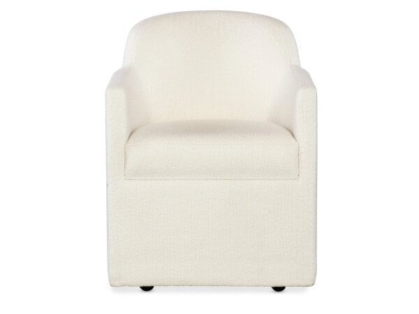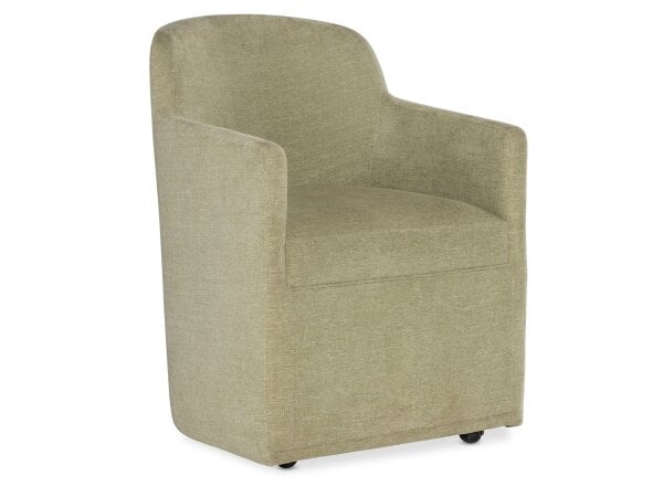 The Americana Farmhouse upholstered side chair, with a black finish and crafted from rubberwood solids, features a tufted back in truffle linen fabric. It offers web seating for comfort, nylon chair glides, and tapered legs, supporting up to 300 lbs.