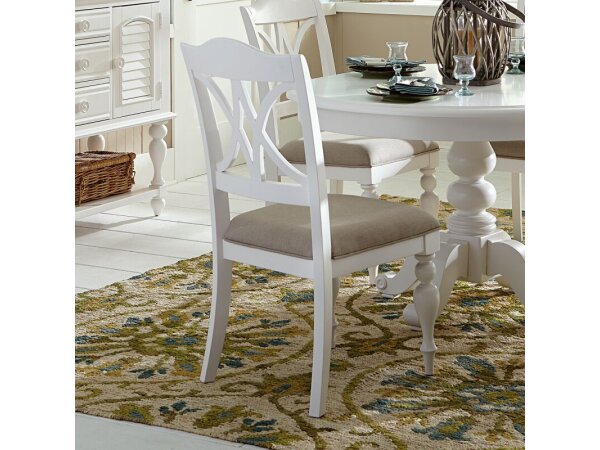 The Americana Farmhouse upholstered side chair, with a black finish and crafted from rubberwood solids, features a tufted back in truffle linen fabric. It offers web seating for comfort, nylon chair glides, and tapered legs, supporting up to 300 lbs.