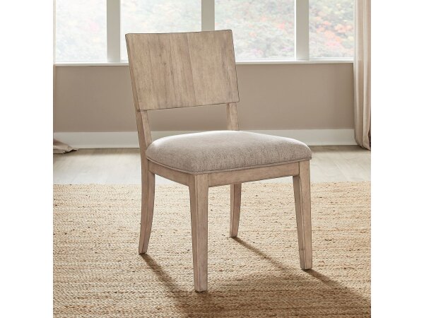 This splat back side chair features a comfortable padded seat upholstered in Gravel Linen fabric. Its design is completed with sturdy, square tapered legs.
