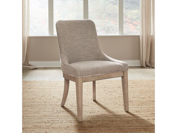 This upholstered side chair features textured barley upholstery and a softly shaped chairback for comfort. Its design is defined by tapered legs with chamfered edges and includes nylon glides to protect floors.