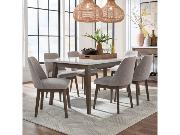 This 7-piece dining set comes with a rectangular table and six side chairs. The table has a fixed, faux white marble top and angled splayed legs, complemented by chairs with fully upholstered seats and backs.