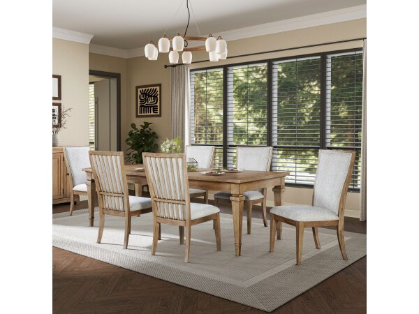 This 7-piece rectangular dining set includes a leg table and six spindle back side chairs. The table features an 18-inch self-storing leaf, making it easy to expand your dining space when needed.