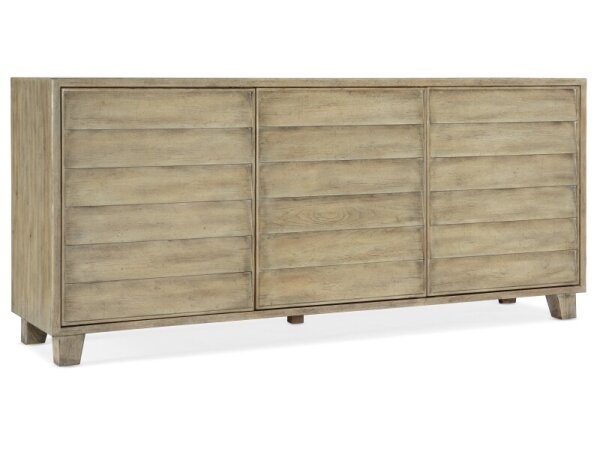 76 in. buffet with shutter-style doors, 3 doors with soft-close hinges, two self-closing drawers (felt liner and silverware tray), and adjustable shelves; Quartered Pine/Maple veneers in light Driftwood.