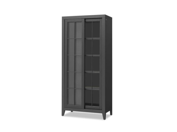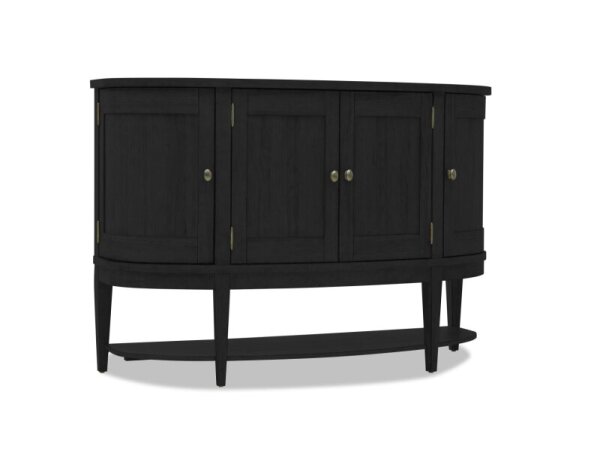 This Farmhouse Reimagined server, crafted from pine and poplar solids with hickory and pine veneers, boasts an antique white finish with a chestnut top and heavy distressing. It offers ample storage with four wood-framed doors, two full-extension drawers,