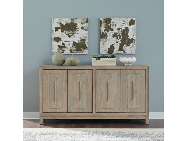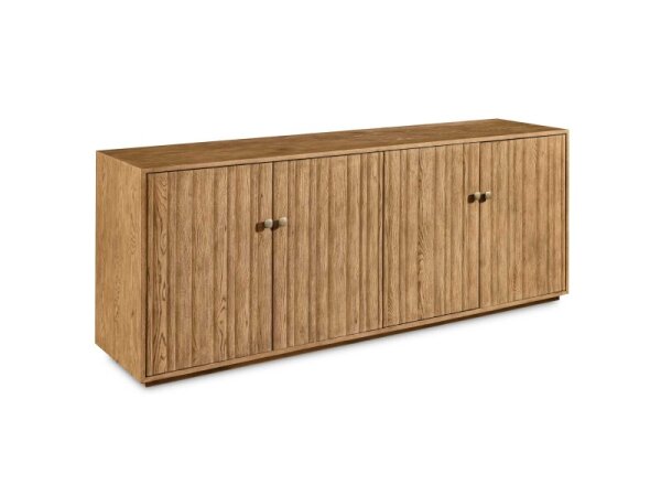4-door sideboard with textured oak reeding and a modern plinth base, featuring soft-close doors with adjustable shelving and cable management. Measures 84 in. W x 20 in. D x 32 in. H.