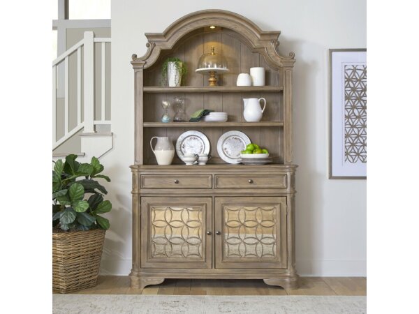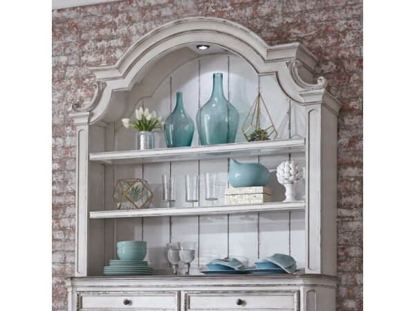 This Magnolia Manor II hutch, crafted from poplar solids and white oak veneers with a Weathered Bisque finish, features a softly arched shape with dog bone accents and bead molding. It includes touch LED lighting to illuminate two wood-framed adjustable g