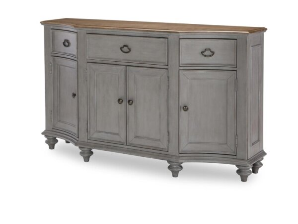 This rustic Double Bridge sideboard is crafted from rubberwood solids and acacia veneers with a dark chestnut finish. It offers multiple storage options, including an adjustable shelf, felt-lined drawers with full extension glides, and removable X-shaped