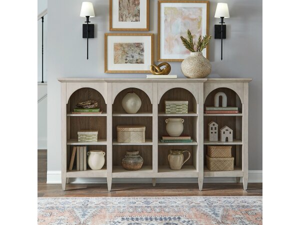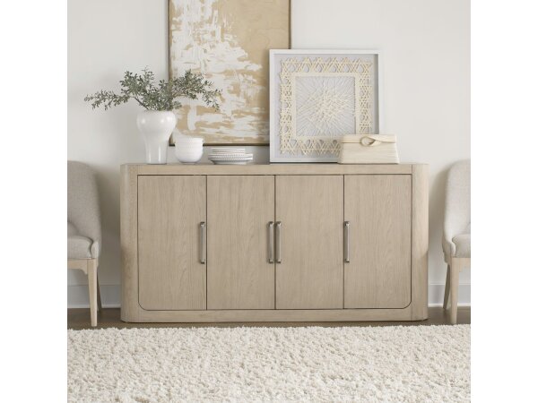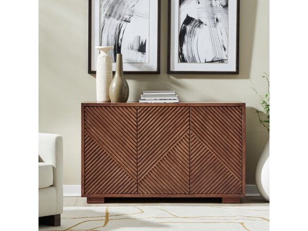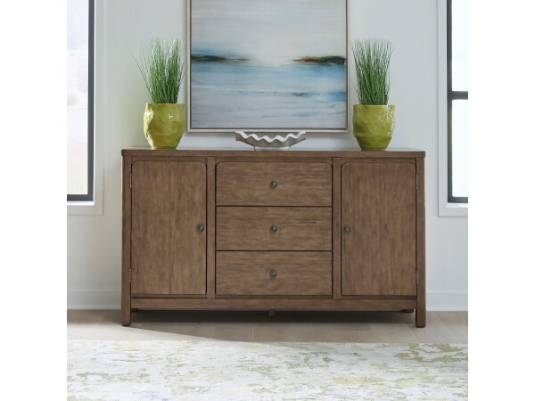 Crafted from rubberwood solids with knotty white oak veneers, the Harvest Home door server features a chalkboard finish and a unique solid wood mosaic front. It offers ample storage with four doors, two adjustable shelves, two felt-lined drawers, and a bo