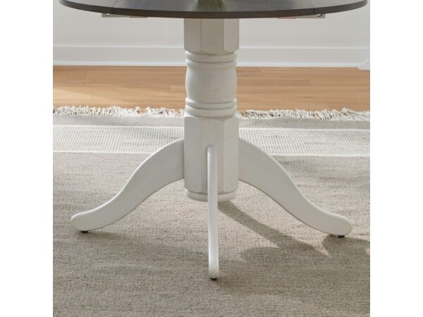 This Brook Bay drop leaf table base is crafted from rubberwood solids and mindy veneers, featuring a textured white finish. It boasts a heavy turned pedestal base with shaped splayed feet, ideal for supporting a drop leaf tabletop.