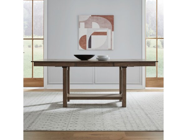 This trestle table top is crafted from rubberwood solids and cathedral white oak veneers with a rich Cappuccino finish. It includes a 20-inch self-storing leaf on an Easy Glide system for effortless expansion.