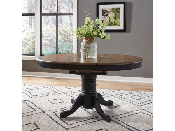 This Carolina Crossing oval pedestal table top is crafted from rubberwood solids with an antique honey finish. It features a 15-inch butterfly leaf for easy expansion, making it a versatile dining piece.