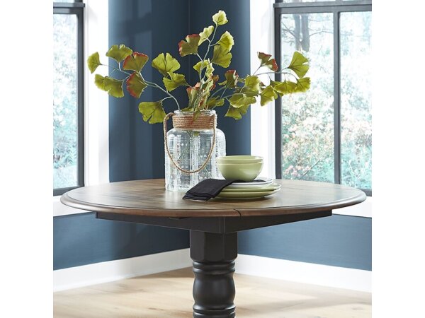 This Brook Bay drop leaf tabletop features a carbon gray finish, crafted from rubberwood solids and mindy veneers. It includes two 8-inch drop-down leaves, offering versatile space-saving functionality for your dining area.