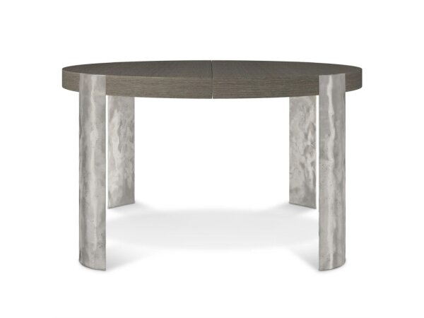 Rectangular dining table with a herringbone walnut veneer top and a soft-brushed brass X-base. Includes one 20 in. leaf to extend to 100 in., seating up to eight.