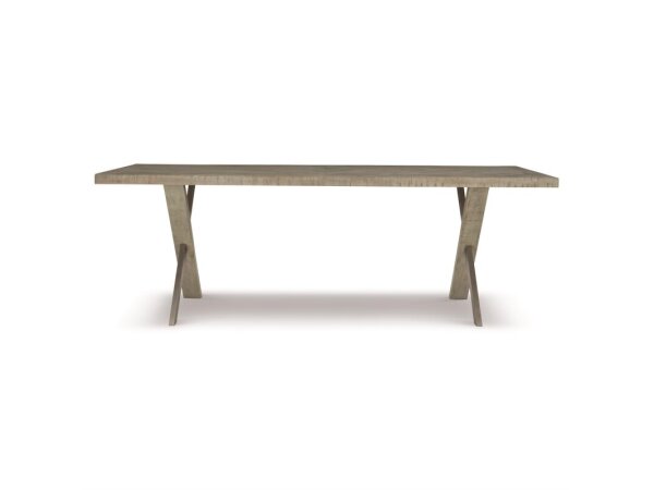 Rectangular dining table with bamboo-motif accents and slender bamboo-style legs, finished in White Heron with a solid-wood edge top. Includes a 20 in. leaf to extend to 88 in. for larger gatherings.