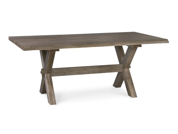 Live-edge dining table with a 1.75 in. solid maple top and X-style base, featuring exposed mortise-and-tenon joinery. Measures 72 x 42 in. and seats 4-6.