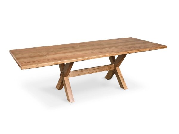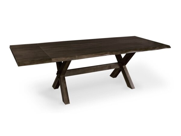 Solid homegrown maple dining table with extendable leaves that maintain continuous wood grain and edge shape. Choose live edge or straight for an authentically styled gathering space.
