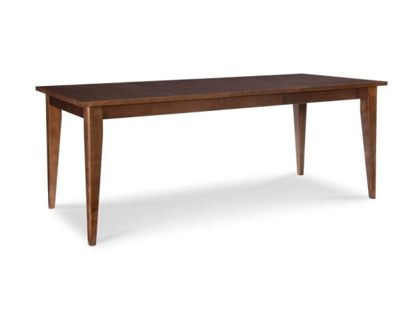 Rectangular wood dining table with tapered legs and precision-fit leaves, artisan crafted in the USA. Includes two 18 in. leaves to seat 8–10; available in maple or oak finishes.