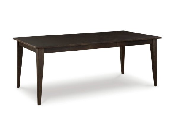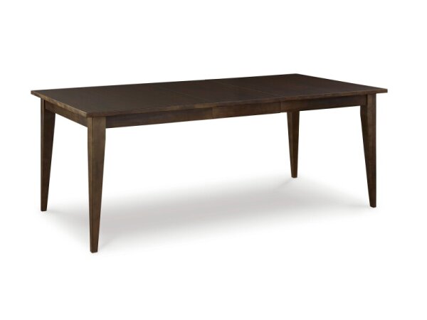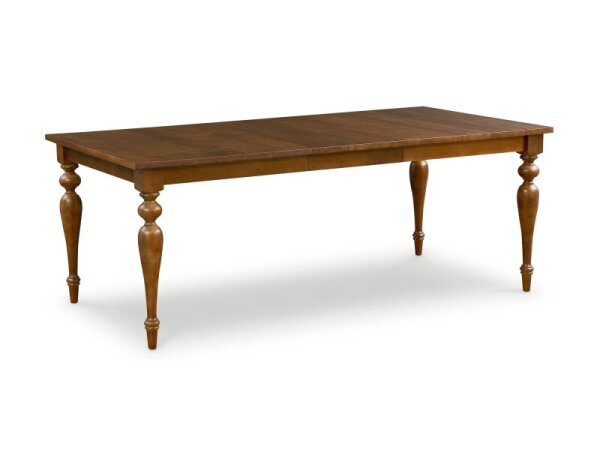 Rectangular wood dining table with tapered legs and precision-fit leaves, artisan crafted in the USA. Includes two 18 in. leaves to seat 8–10; available in maple or oak finishes.