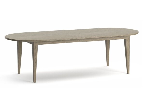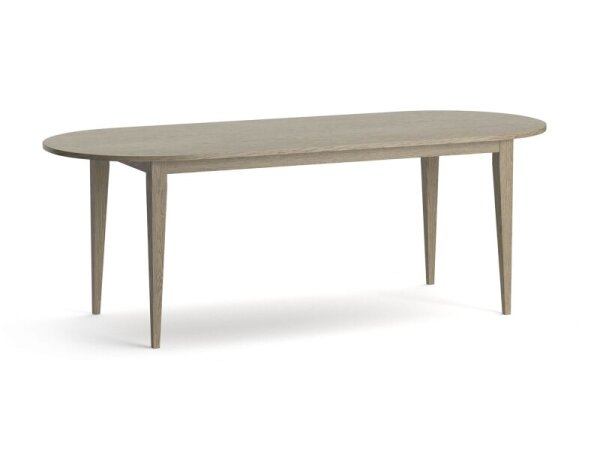 Counter-height oval dining table in solid white oak with a 1 in. thick top and contemporary tapered legs. Seats 4–6; available in lightly distressed finishes and 84 or 102 in. lengths.