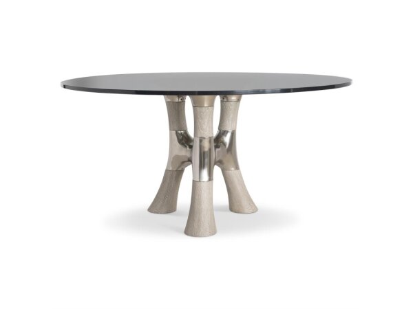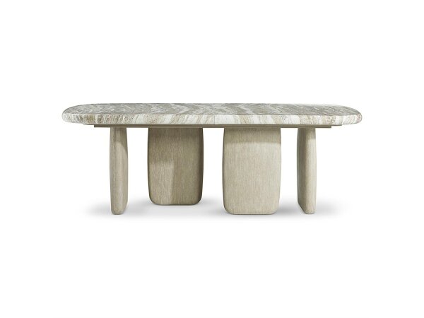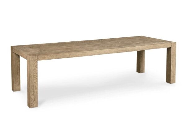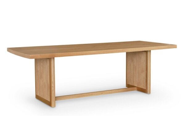Modern Parsons-inspired dining table with a 96 in. x 40 in. coved top in textured white oak, seating eight comfortably. Panel base with inlaid fluting and a stabilizing stretcher; 30 in. high, 2 in. thick top.