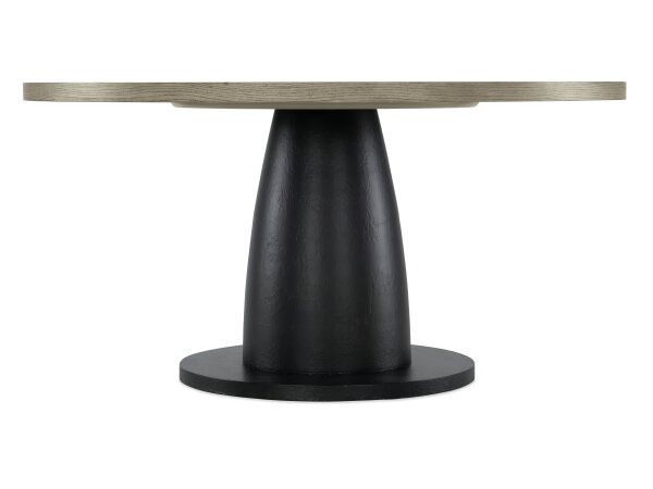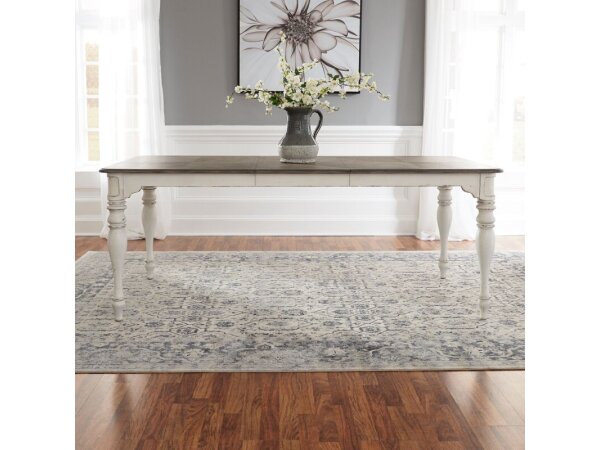 The Magnolia Manor rectangular leg table, crafted from poplar solids with white oak and birch veneers, showcases European design with a weathered brown top. It features two 18-inch leaves, a fancy face veneer dining top, canted corners, and faceted turned