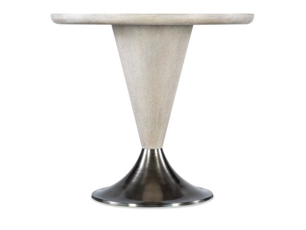 A modern round dining table in Quartered Oak Veneers with a dark, earthy finish and warm pewter metal banding on the base. Includes one 18 in. leaf to extend to 72 in. round.