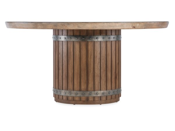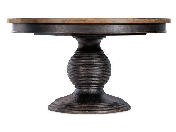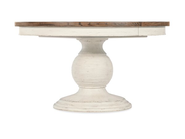 54" (137.2 cm) Casual Dining Americana Round Pedestal Dining Table w/1-22in leaf enriched by Oak Veneers, Resin with Solid-Wood Edge Top, making it a distinctive interior accent.