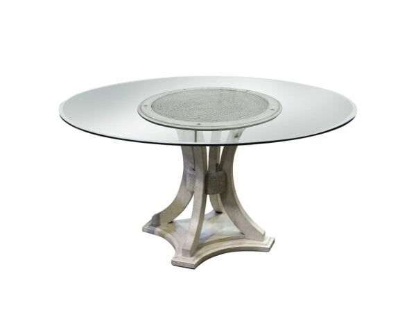 Round dining table with an aluminum nailhead-trimmed top and a Belgian-inspired pedestal base. Adjusts from 30 in. dining height to 36 in. counter height and seats up to six.