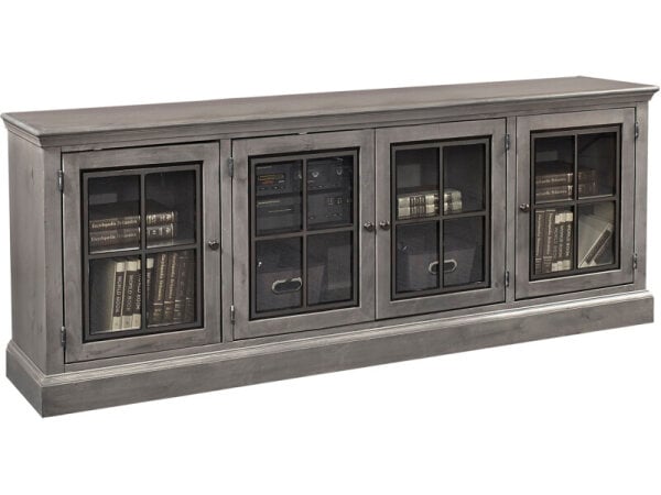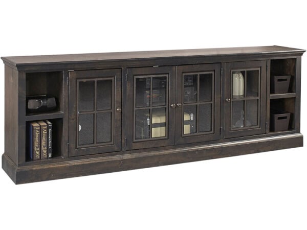 A City View 82 inch TV console crafted from rubberwood solids and quartered white oak veneers, showcasing a coffee bean finish and reeded doors. It includes adjustable wood shelving, European soft-close hinges, and wire management for a clutter-free setup
