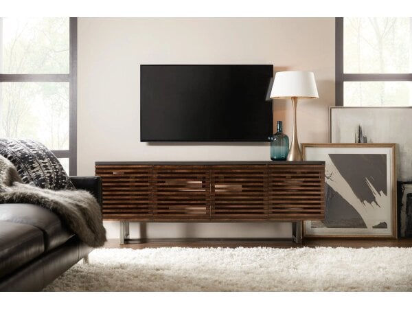 Striking 78 in. entertainment console wrapped in German silver foil over mango wood for a jewelry-like sheen. Four doors conceal removable shelves with ventilated backs in each section, accommodating TVs up to 80 in.