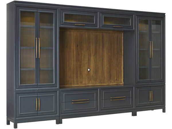Striking entertainment console with reverse hand-painted, marble-look glass doors in a Noir finish and antique silver tab pulls. Soft-close 3-door storage includes adjustable shelves, a ventilated back and built-in outlets, supporting up to an 80 in. TV.