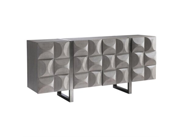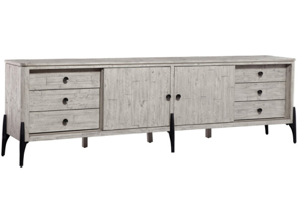 Modern media console in mango wood with contrasting gray and bone doors, rustic light finish, and iron base with matte zinc hardware. Three doors with removable shelves and a ventilated back; accommodates up to a 70 in. TV.