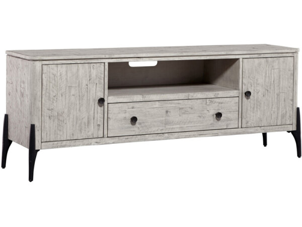 Entertainment console in Flaky White with hand-distressed, wire-brushed finish and perforated sliding doors. Includes three adjustable shelves, a ventilated back, a 3-plug outlet, and supports up to an 80-in. TV.