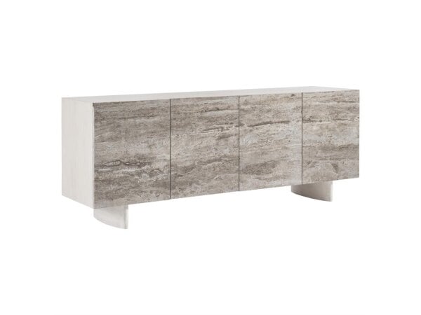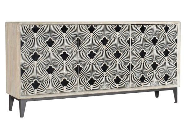 Contemporary entertainment center in mango wood with black-and-white bone inlay, gray metal base, and an off-white interior. Soft-close doors, removable shelving, 3-plug outlet, and a ventilated back; fits up to a 70 in. TV.