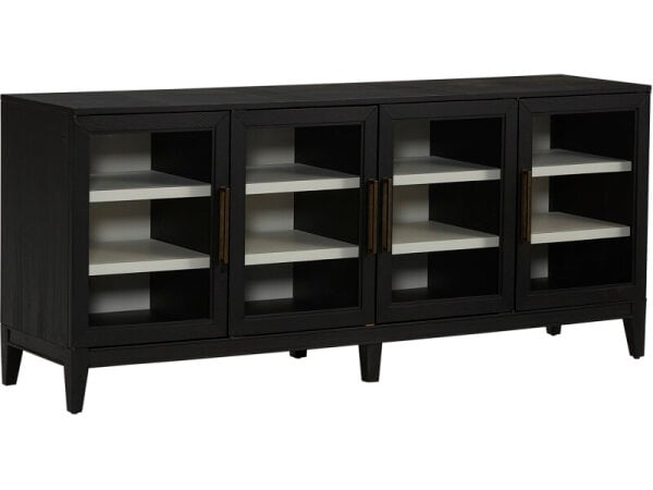 Entertainment console in Charred Black Shou Sugi Ban pine with four soft-close doors, adjustable shelves, and a ventilated back with power. Accommodates TVs up to 80 in.