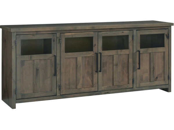 This Mercury 76" TV Console features a contemporary, simplistic design, crafted from rubberwood solids and scratch-resistant melamine in a driftwood gray finish. It provides two drawers, an open compartment with wire management, tapered block feet, antiqu