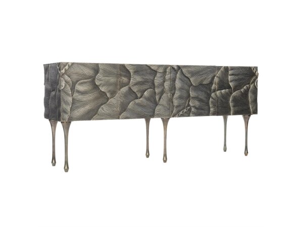 Entertainment console in creamy white with shimmering capiz shell inlay and silver-tone metal base, sized for up to a 75 in. TV. Four soft-close doors conceal storage with a ventilated back panel and built-in power.
