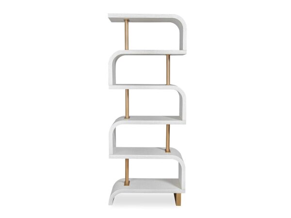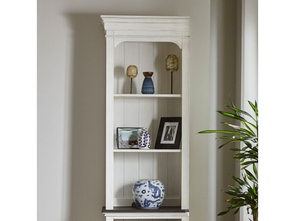 The Allyson Park right pier hutch, made from pine solids and veneers, has a wirebrushed white finish and bead molding. It includes two adjustable shelves and wire management provisions for versatile storage.