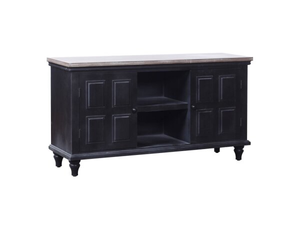 This Ocean Isle left pier top is crafted from rubberwood solids and pine veneers with an antique white and weathered pine finish. It features crown molding, wire management, and two adjustable shelves.