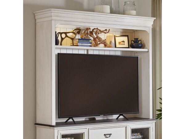 The Allyson Park Entertainment Hutch is crafted from poplar solids and oak veneers with a wirebrushed white finish. It features LED touch lighting, an adjustable shelf, and wire management provisions to conceal wiring.