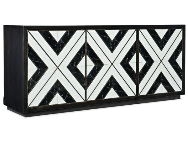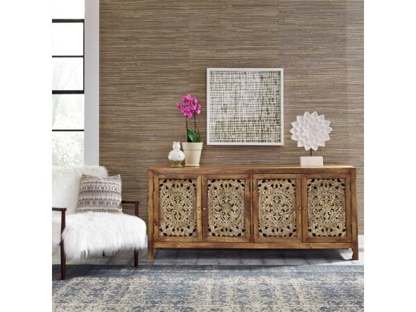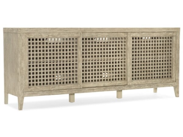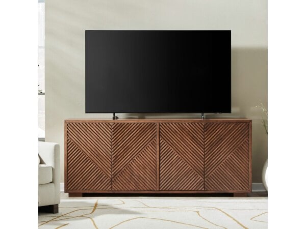 The Easton 82" TV Console is crafted from poplar solids and walnut veneers with an Urban Bronze finish, showcasing a contemporary design. It features four reeded pattern doors with European hinges and magnetic latches, adjustable shelves, wire management,