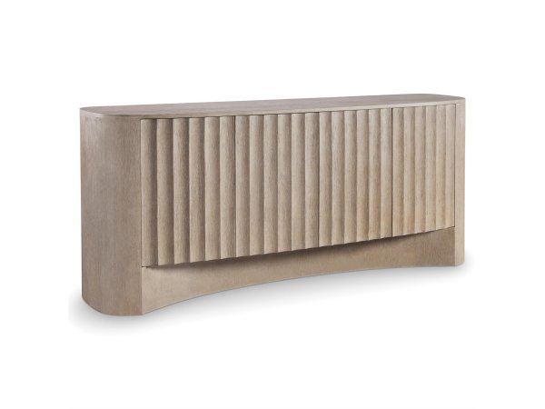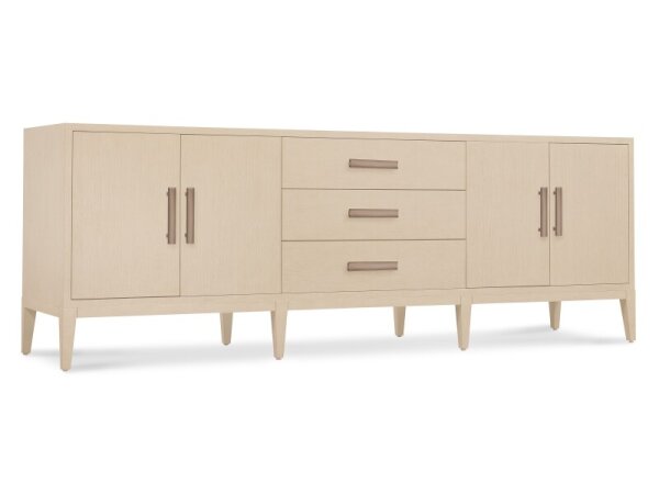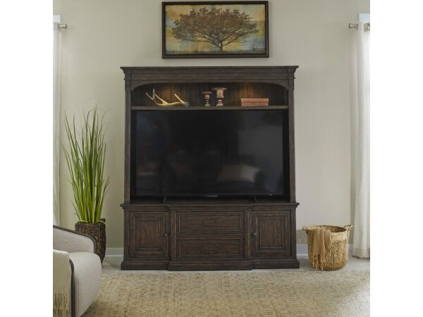 The Paradise Valley entertainment hutch is crafted from rubberwood solids and white oak veneers with a saddle brown finish. It features heavy top crown, chamfered pilasters, bead molding, touch LED lighting, and wire management provisions, perfect for cre