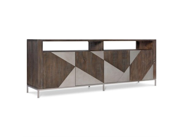 Elevate your living space with this casual country-style Lake House TV console, crafted from poplar solids and oak veneers. It features wire management, a planked top, sliding barn doors with adjustable shelves, and antique brass hardware.