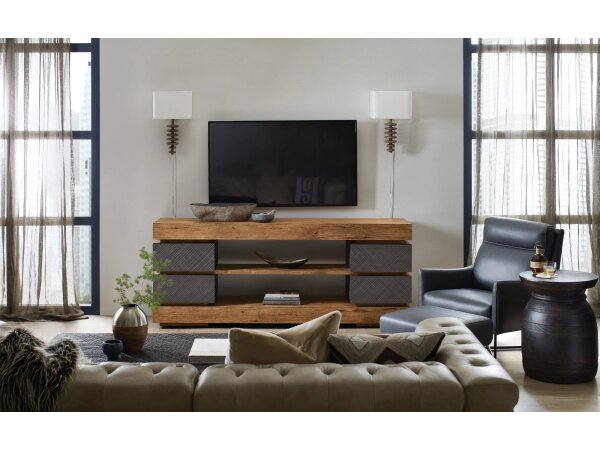 Media console in Vintage Natural Pecky Hickory accommodates up to an 80 in. TV. Features 4 soft-close doors, adjustable shelving, a self-closing drawer, ventilated back panel, and integrated power.