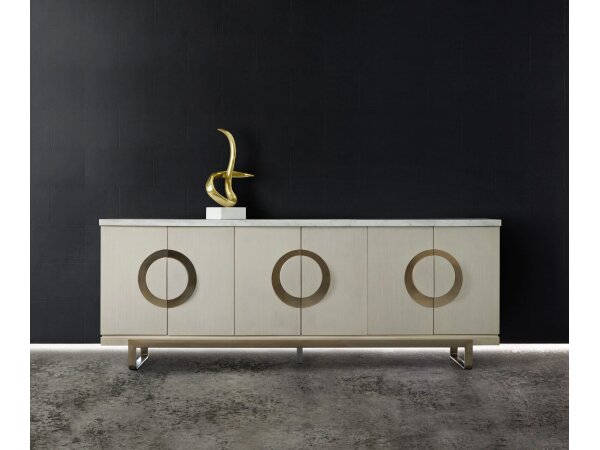 Credenza with a white marble top, cream finish, and gold accents, accommodating up to an 80 in. TV. Six soft-close doors with adjustable shelving, ventilated back, and a 3-plug outlet.